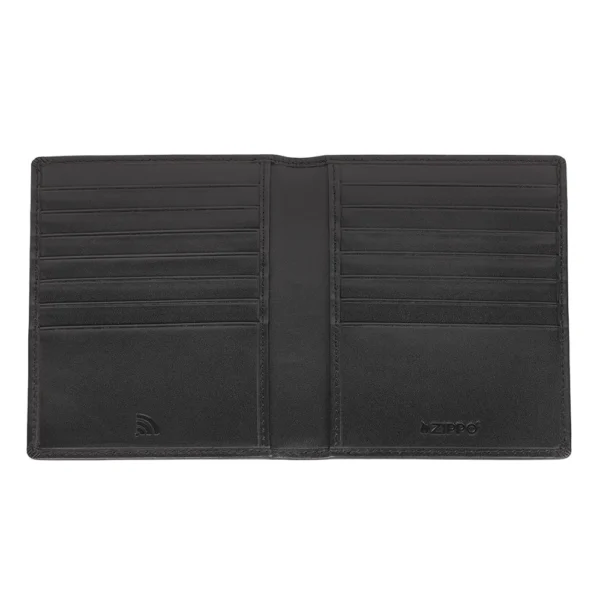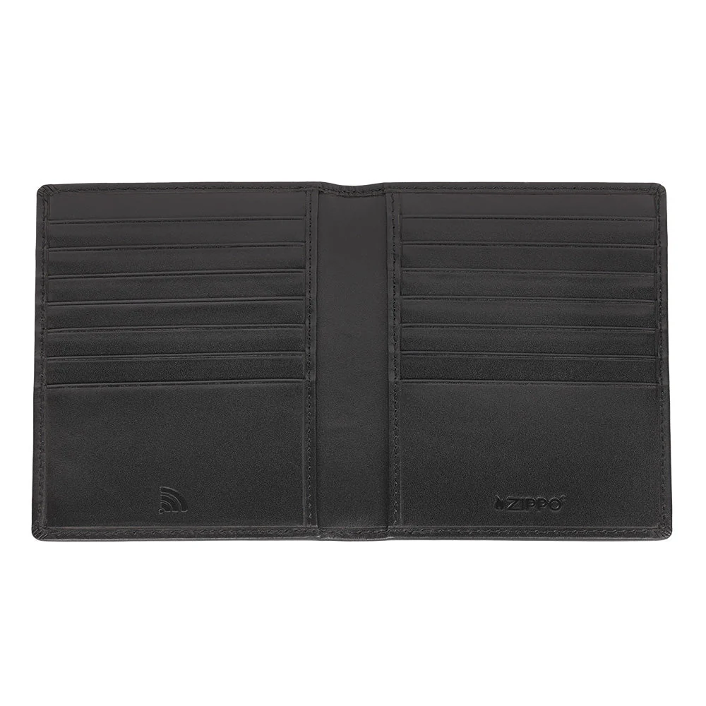 Genuine cowhide black card pocket Metal logo 14,2 x 11 x 1,6cm Weight: 88 g 14 card slots 2 pockets with fastening Jacquard lining RFID-technology