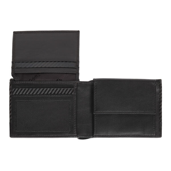 Ehtsast lehmanahast, süsinikkiud välimusega, Integreeritud RFID-tehnoloogia, Jacquard-vooder, Suurus: 11,5 x 9,2 x 1,6 cm, Kaal: 67 g, Värv: must, 2 rahataskut, 2 kinnitusega taskut, 8 kaardipesa