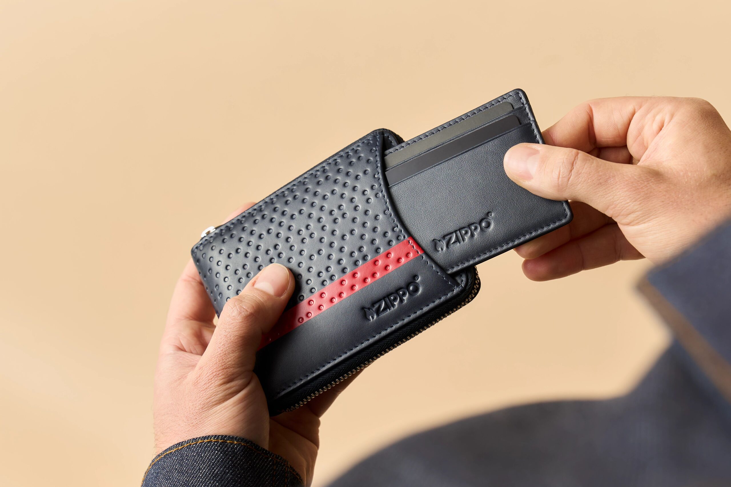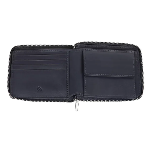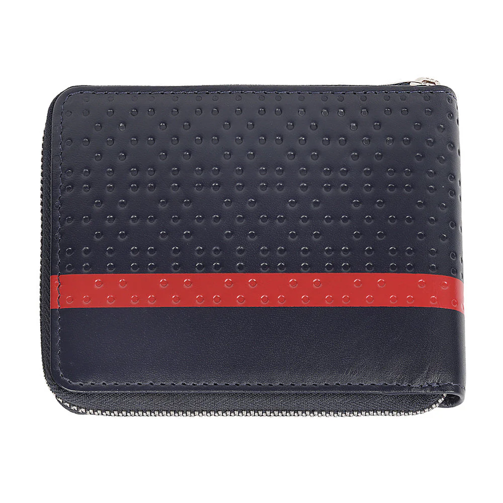 Punase trükiga reljeefne muster, Integreeritud RFID-tehnoloogia, Eemaldatav kaardihoidja, Ehtne lehmanahk, Puuvillane vooder, Suurus: 12 x 10,5 x 2,6 cm, Kaal: 119 g, Värv: mereväe sinine, 2 rahataskut, 2 lükandtaskut, 8 krediitkaardipesa (millest 4 on eemaldatavas kaardihoidikus), 1 münditasku