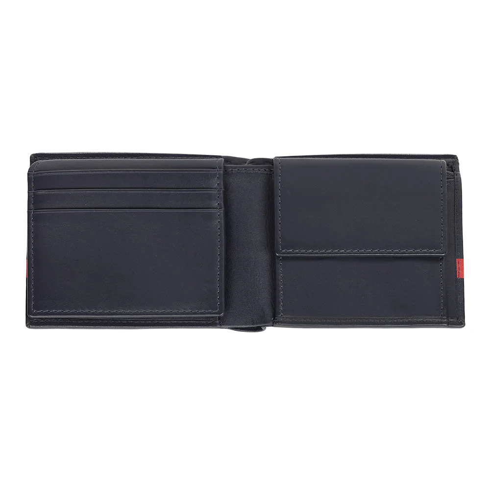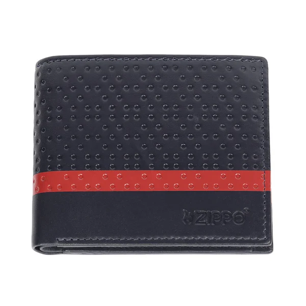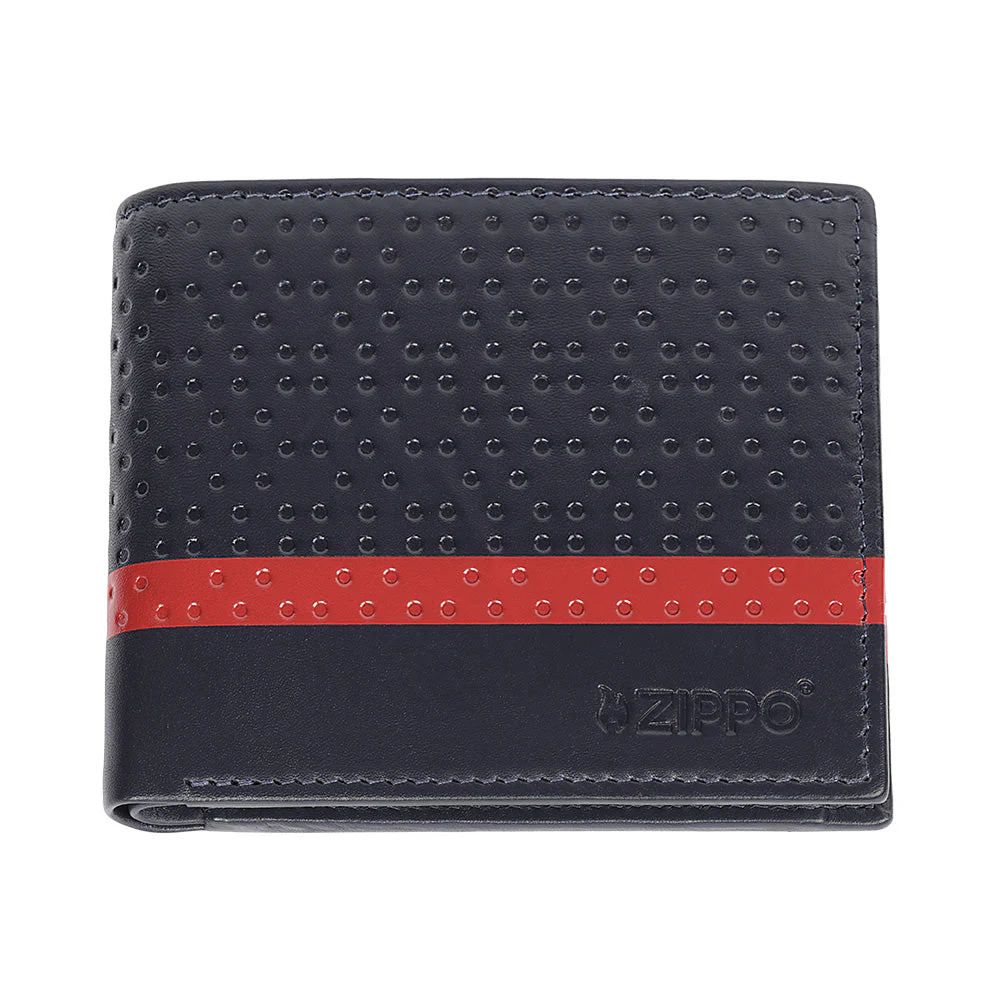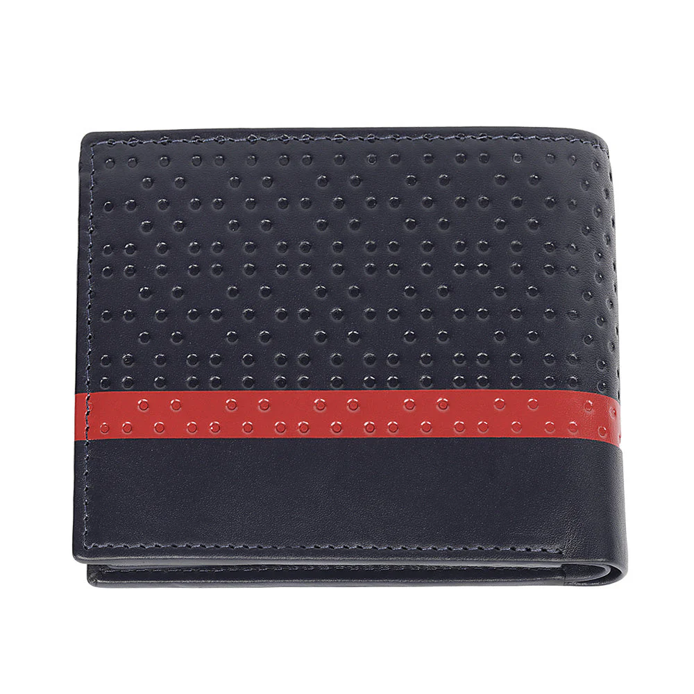 Embossed pattern in red print Integrated RFID technology Genuine cowhide Cotton lining Size: 11,5 x 9,5 x 3 cm Weight: 89 g Colour: navy blue 2 slip pockets 9 credit card slots 1 coin pocket