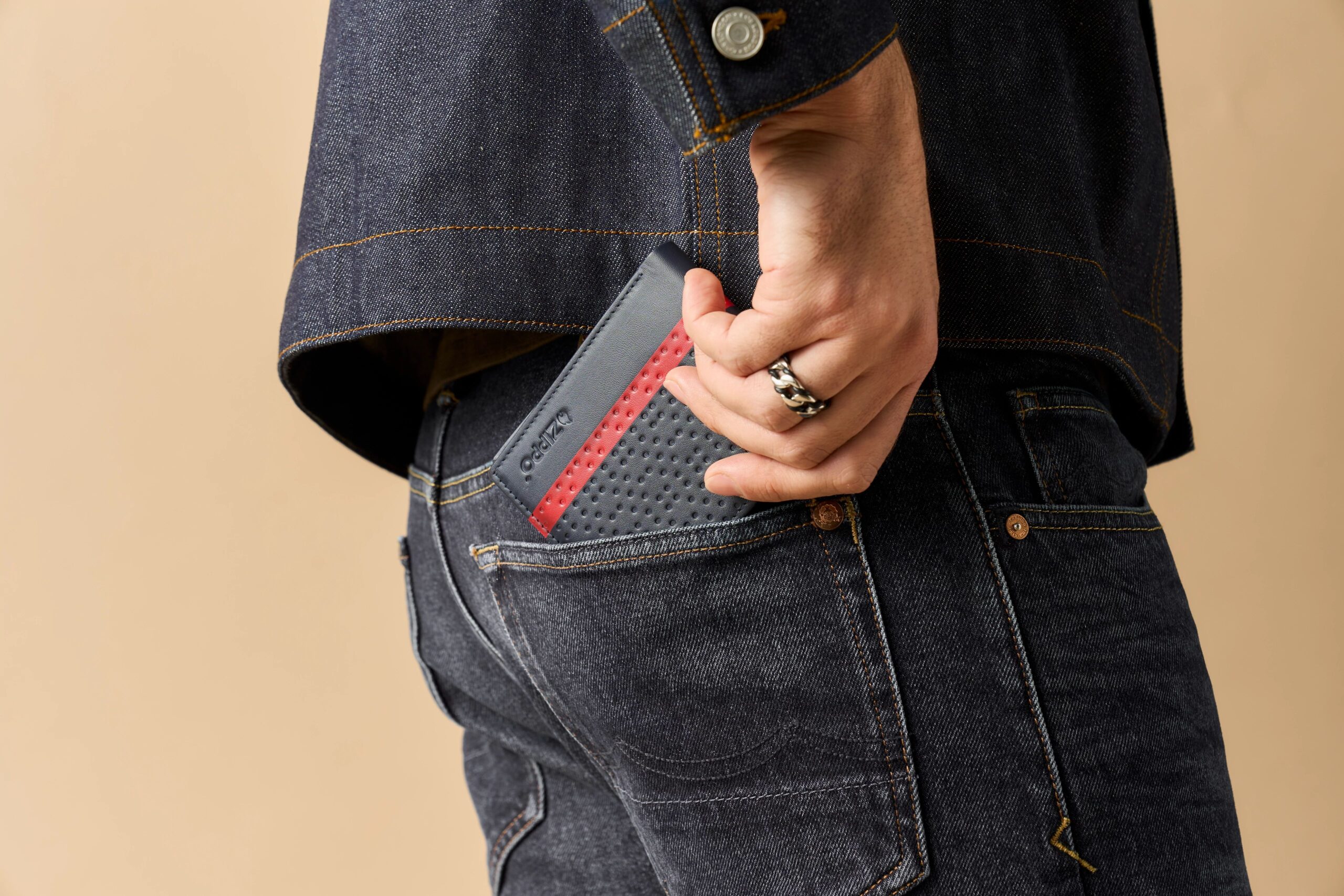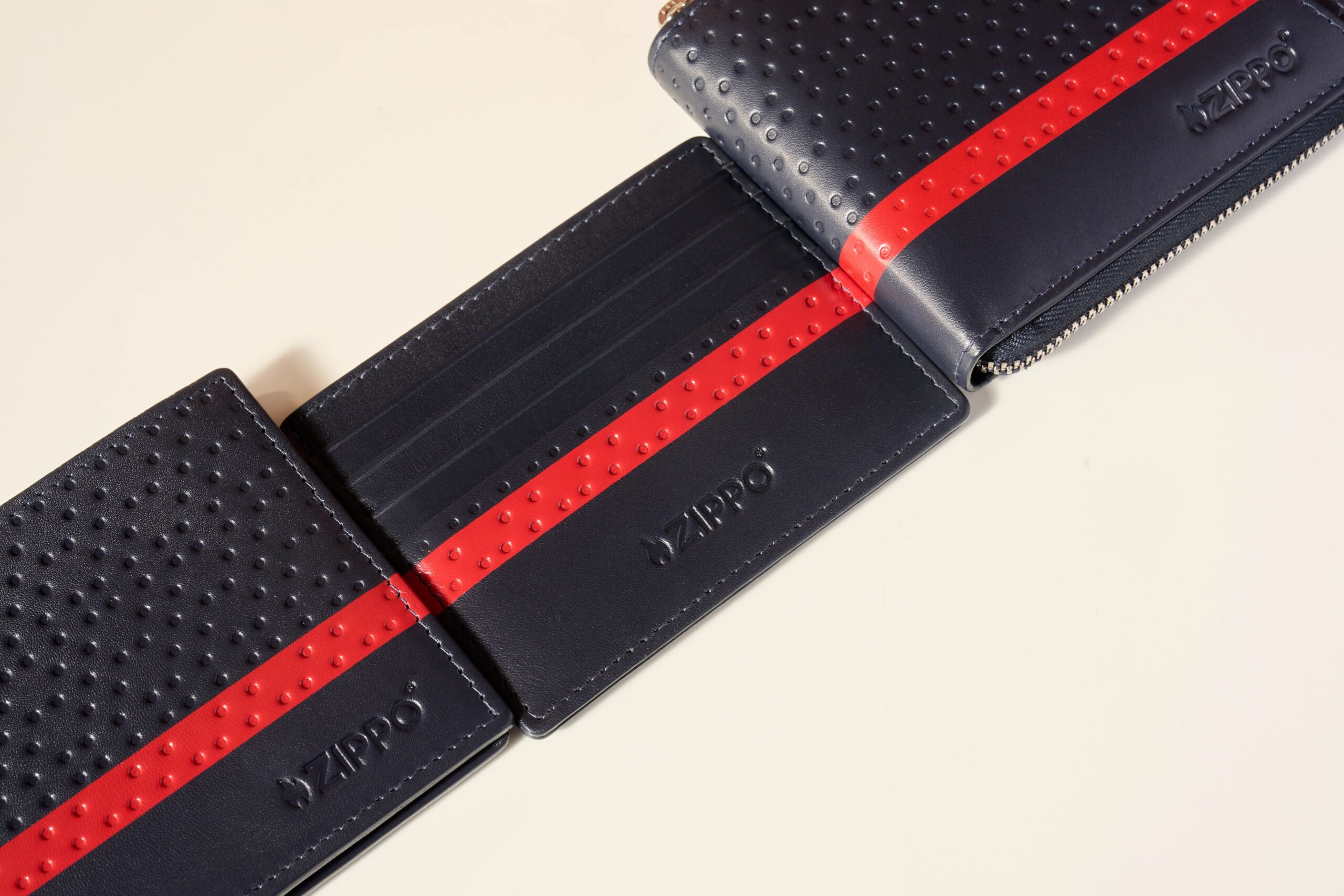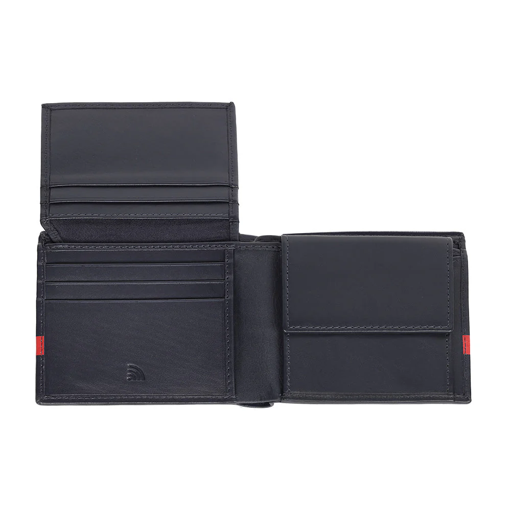 Embossed pattern in red print Integrated RFID technology Genuine cowhide Cotton lining Size: 11,5 x 9,5 x 3 cm Weight: 89 g Colour: navy blue 2 slip pockets 9 credit card slots 1 coin pocket