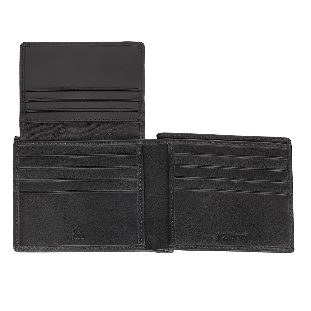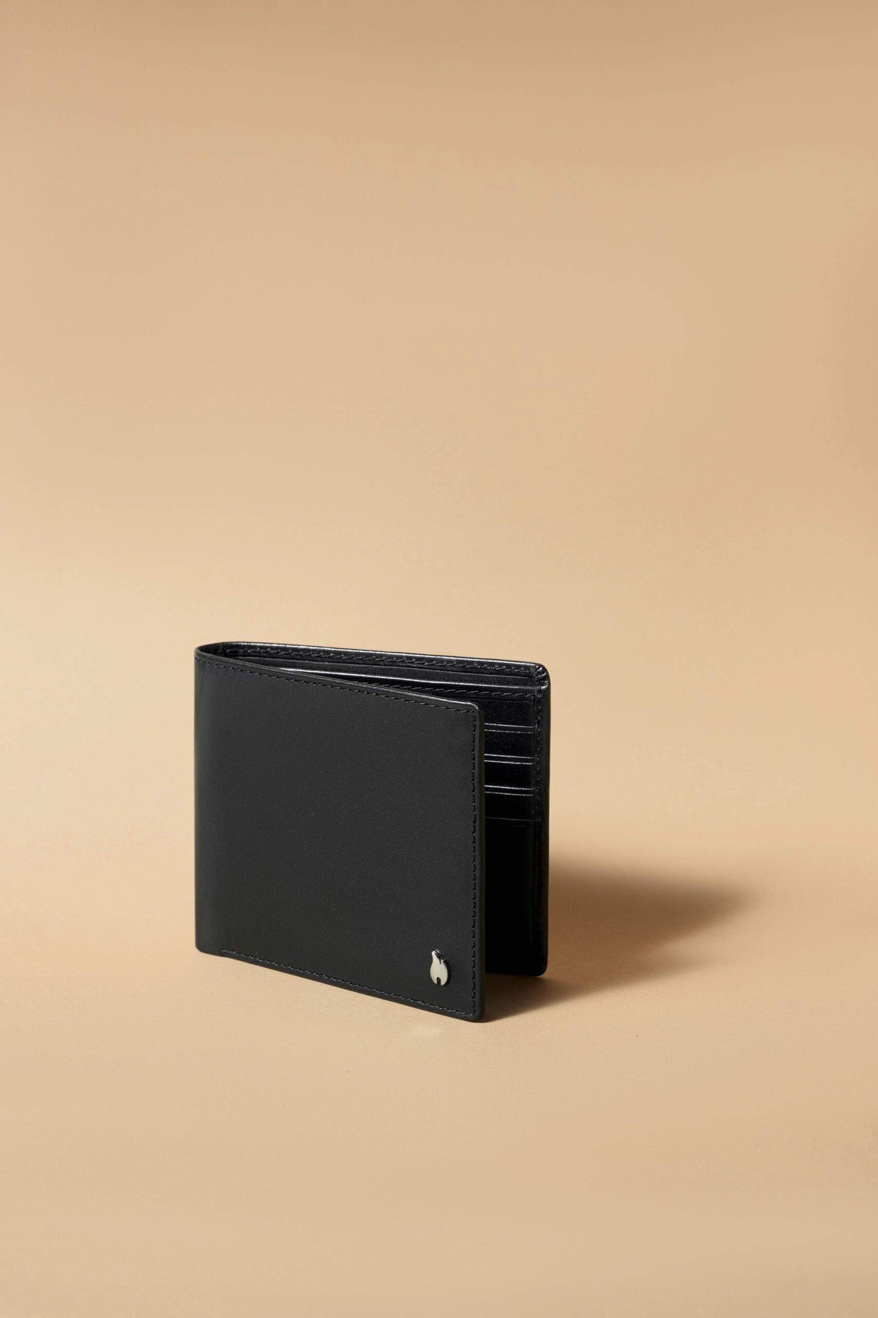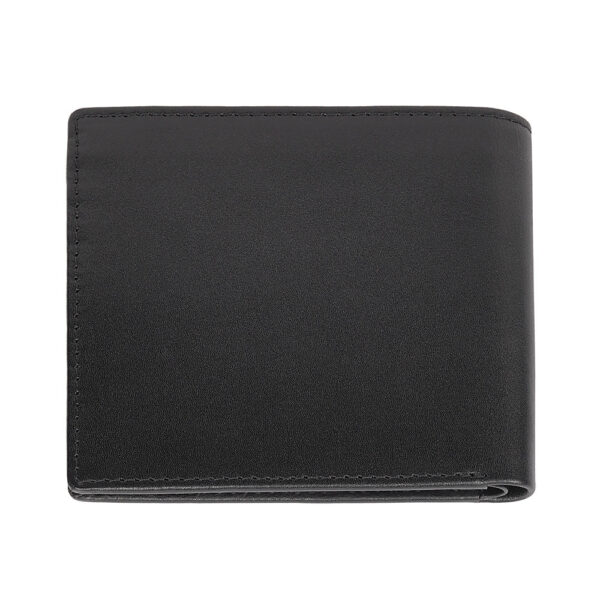Genuine cowhide leather wallet Color: Black Integrated RFID technology Metal logo Jacquard lining Dimensions: 11,5 x 10 x 2 cm Weight: 92 g 2 money pockets 2 attachable pockets 14 card slots