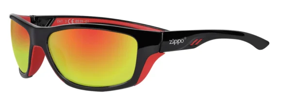 UV400: maximum protection against UVA and UVB rays: Filter category: 3 Optical class: 1 Material: polycarbonate Frame colour: black, with red details Lens colour: Yellow mirror glass. Lens width: 52 Lens height: 41 Front width: 133 Hinge length: 140